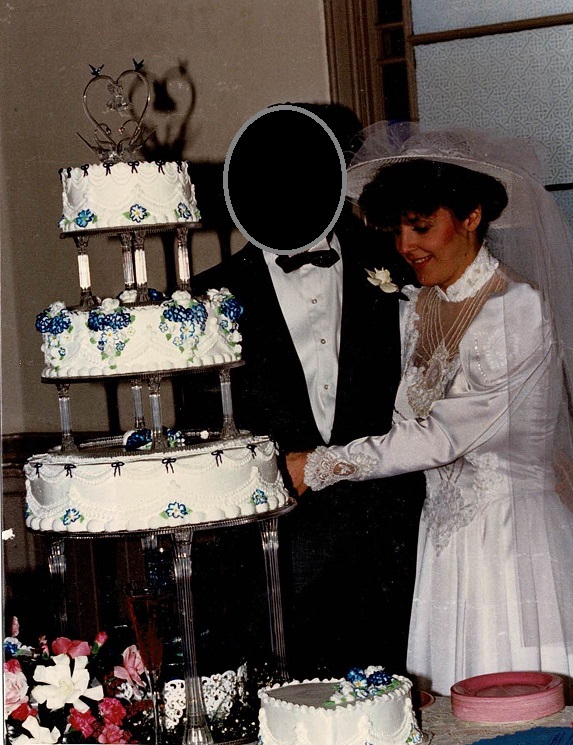 I’ve been saying I’ll post a decent picture of my first dress, from 1986. I have hidden the identity of the groom since I’m sure he doesn’t want to be a part of my blog. And, take a look at that cake! Wow!!! There was a fountain underneath with blue water (yum)!