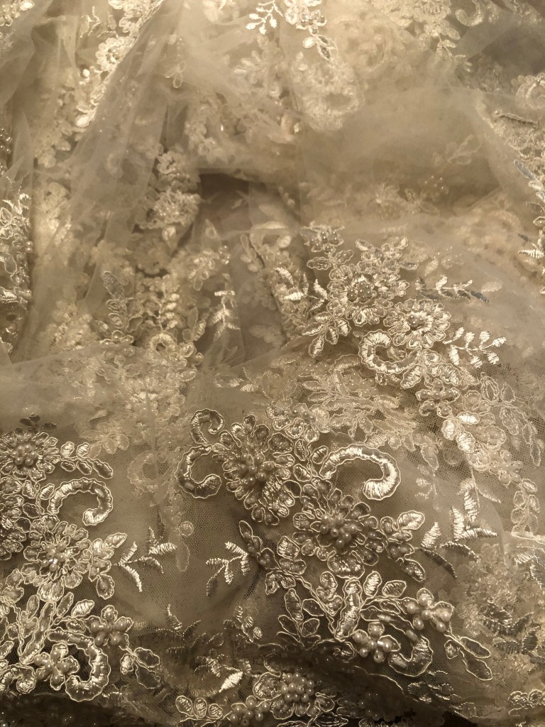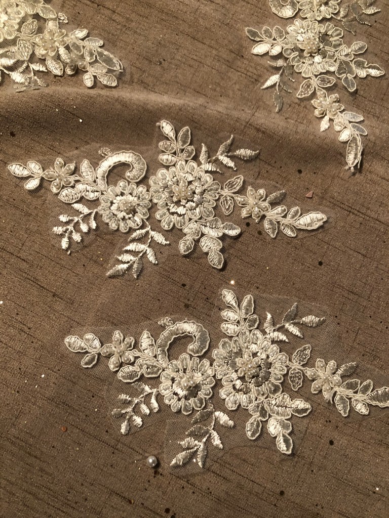 So back to the dress. I purchased some lace a few months ago and it was spendy. I only got a yard. A few weeks later, I’d gone back to JoAnn’s and found the same lace fabric on clearance for 60% off. I bought three yards. The background is netting and the lace on the face of the fabric is actually “appliques.” So there is a recurring pattern along both edges and then recurring individual appliques in the middle on both sides of the netting. It is really complicated to explain and now that I’ve cut it up, I cannot really take a picture of the entire fabric. I cut the edge off to place on the hem of the outerdress. I didn’t really think it would take anymore than one side (which is nine feet). Well, apparently, I was wrong. The hem must be about twelve feet or so. I pinned on the lace and will hand sew it on.